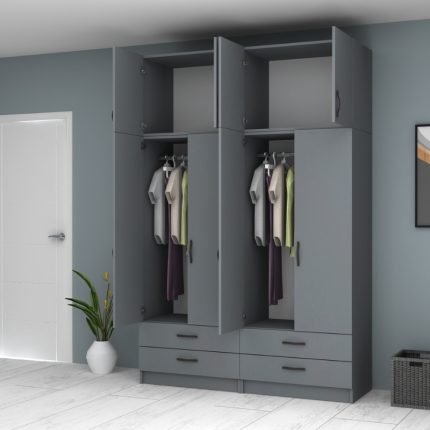 Original price was: 873,00 €.740,00 €Η τρέχουσα τιμή είναι: 740,00 €.Ντουλάπα ρούχων Ricardo Megapap εξάφυλλη με πατάρι και συρτάρια χρώμα ανθρακί 240×51,8×240εκ.