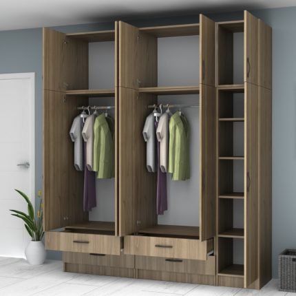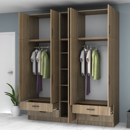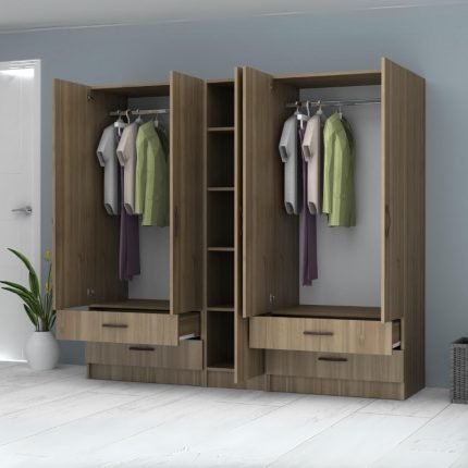 Original price was: 1.036,00 €.880,00 €Η τρέχουσα τιμή είναι: 880,00 €.Ντουλάπα ρούχων Ricardo Megapap εξάφυλλη με πατάρι και συρτάρια χρώμα καρυδί 240×51,8×240εκ.