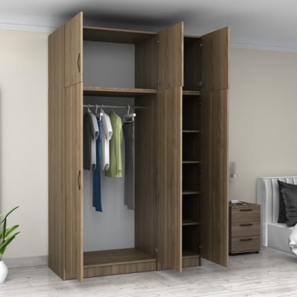Original price was: 575,00 €.485,00 €Η τρέχουσα τιμή είναι: 485,00 €.Ντουλάπα ρούχων Victoria Megapap τρίφυλλη με συρτάρια χρώμα καρυδί 150x60x181εκ.