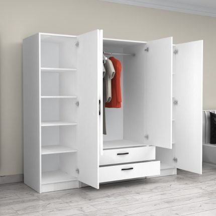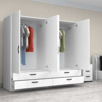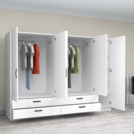 Original price was: 596,00 €.505,00 €Η τρέχουσα τιμή είναι: 505,00 €.Ντουλάπα ρούχων Victoria Megapap τετράφυλλη με συρτάρια χρώμα λευκό 200x60x181εκ.