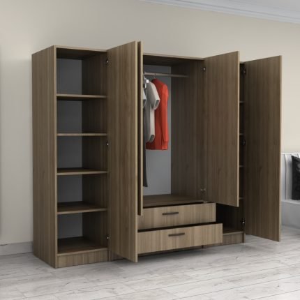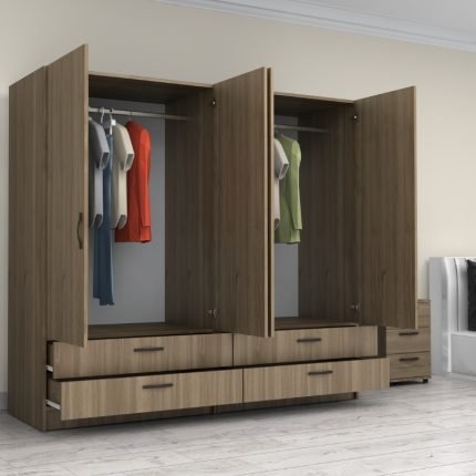 Original price was: 420,00 €.355,00 €Η τρέχουσα τιμή είναι: 355,00 €.Ντουλάπα ρούχων Victoria Megapap τετράφυλλη με συρτάρια χρώμα καρυδί 200x60x181εκ.