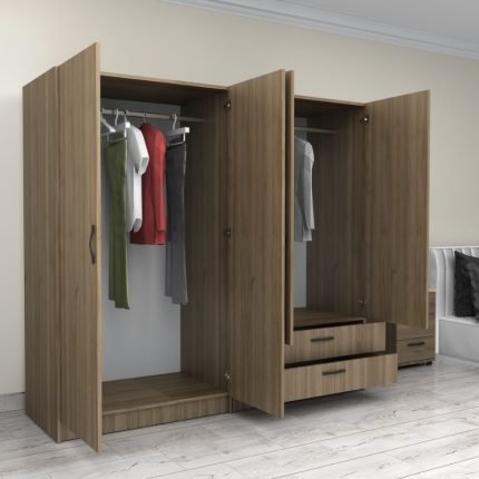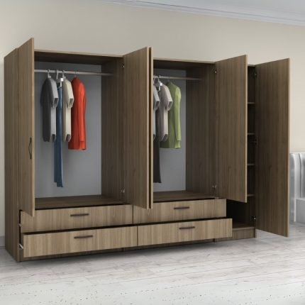 Original price was: 604,00 €.510,00 €Η τρέχουσα τιμή είναι: 510,00 €.Ντουλάπα ρούχων Victoria Megapap τετράφυλλη με συρτάρια χρώμα καρυδί 200x60x181εκ.