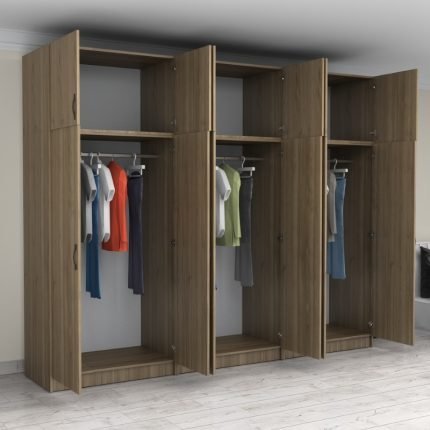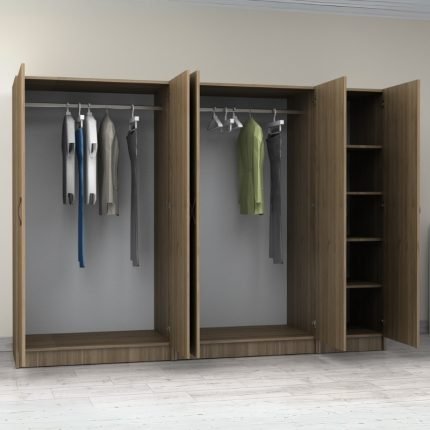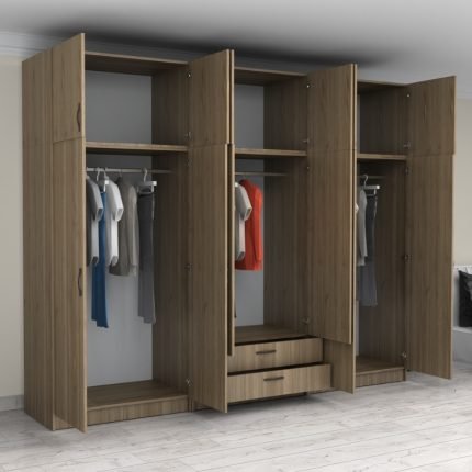 Original price was: 957,00 €.810,00 €Η τρέχουσα τιμή είναι: 810,00 €.Ντουλάπα ρούχων Victoria Megapap πεντάφυλλη με πατάρι χρώμα καρυδί 250x60x240εκ.