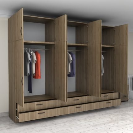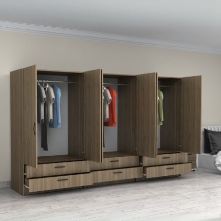 Original price was: 906,00 €.765,00 €Η τρέχουσα τιμή είναι: 765,00 €.Ντουλάπα ρούχων Victoria Megapap εξάφυλλη με συρτάρια χρώμα καρυδί 300x60x181εκ.