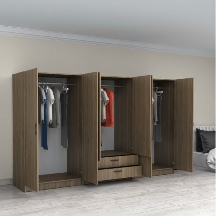 Original price was: 610,00 €.515,00 €Η τρέχουσα τιμή είναι: 515,00 €.Ντουλάπα ρούχων Victoria Megapap εξάφυλλη με συρτάρια χρώμα καρυδί 300x60x181εκ.