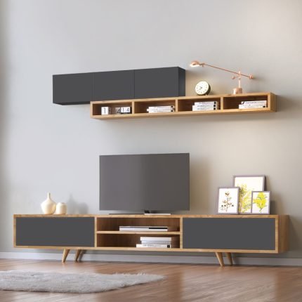 Original price was: 255,00 €.199,00 €Η τρέχουσα τιμή είναι: 199,00 €.Σύνθεση τηλεόρασης Rosaline Megapap χρώμα ανθρακί – sepet oak 233×31,3×196,8εκ.