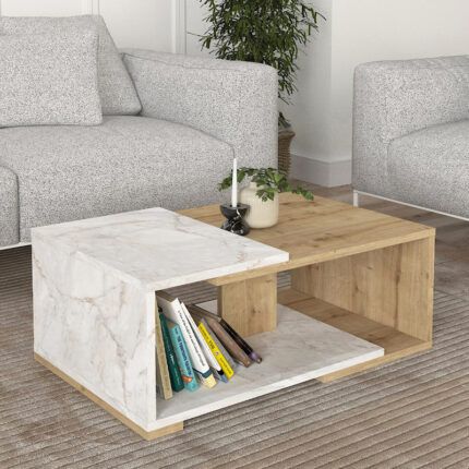 Original price was: 62,00 €.49,90 €Η τρέχουσα τιμή είναι: 49,90 €.Τραπεζάκι σαλονιού Mareta Megapap χρώμα λευκό εφέ μαρμάρου – sapphire oak 81,8x50x35εκ.