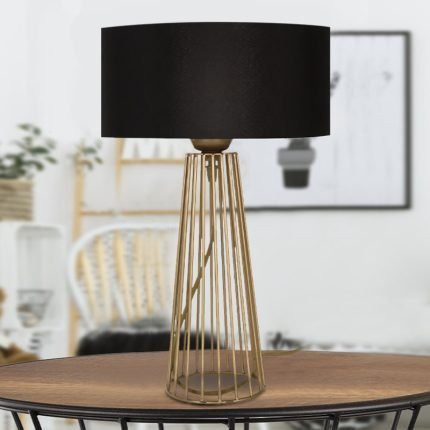 Original price was: 17,00 €.13,90 €Η τρέχουσα τιμή είναι: 13,90 €.Φωτιστικό επιτραπέζιο Santo Megapap E27 ύφασμα Pvc χρώμα μαύρο – χρυσό Ø13×37εκ.