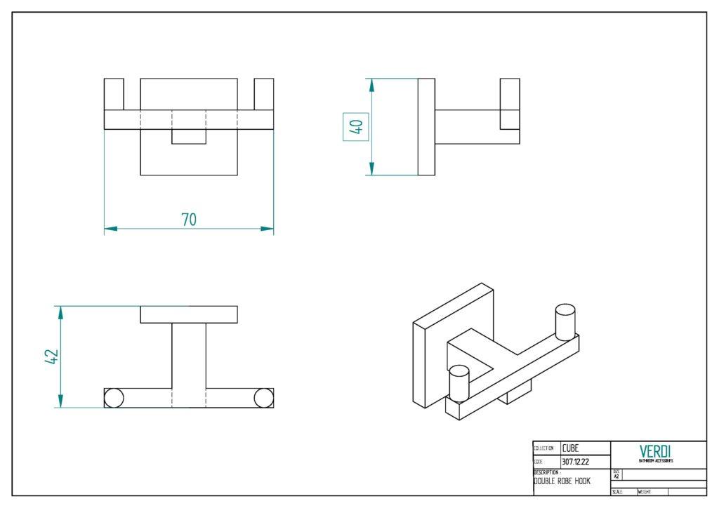 307.12.22 Διπλό Άγκιστρο CUBE 70x42x40 by Verdi