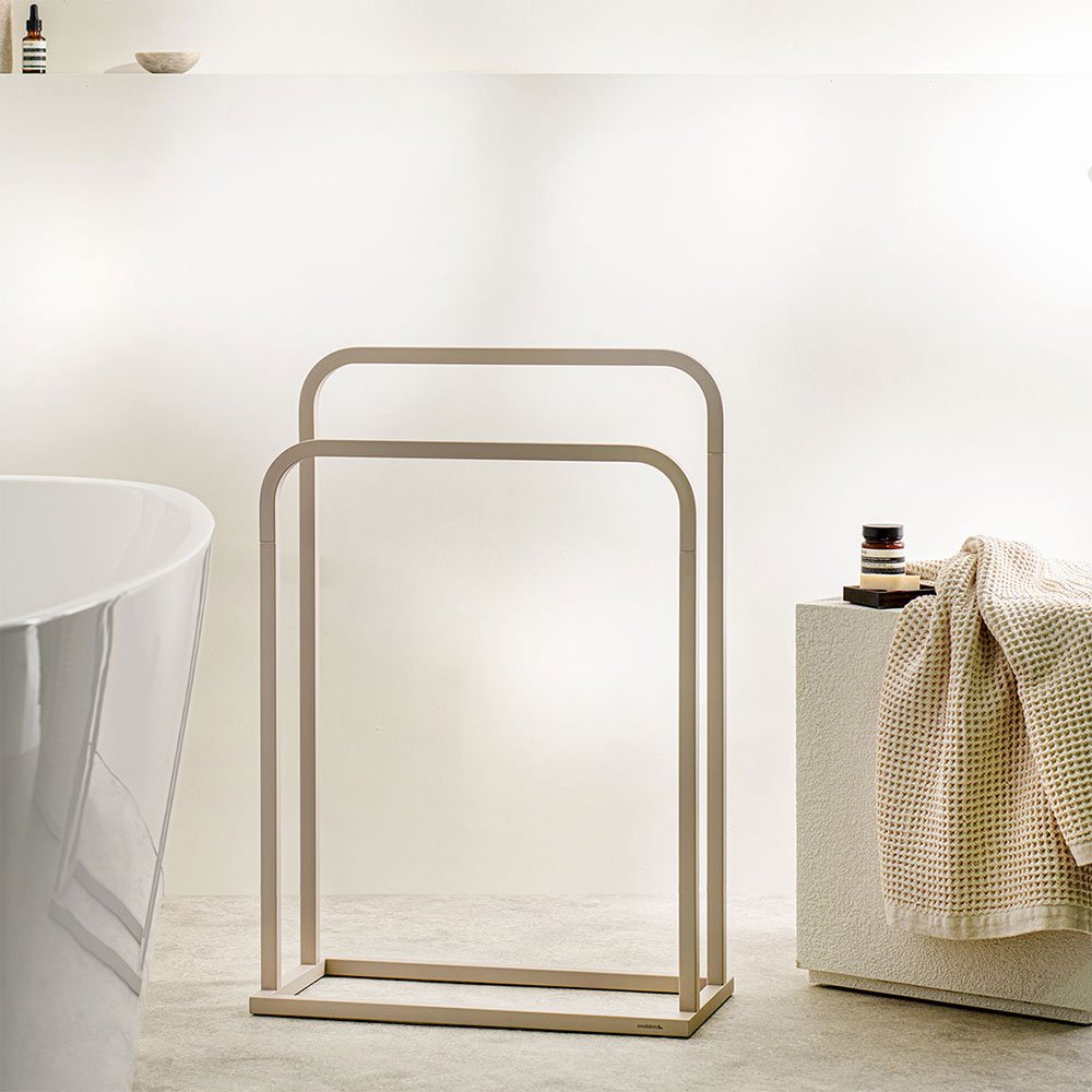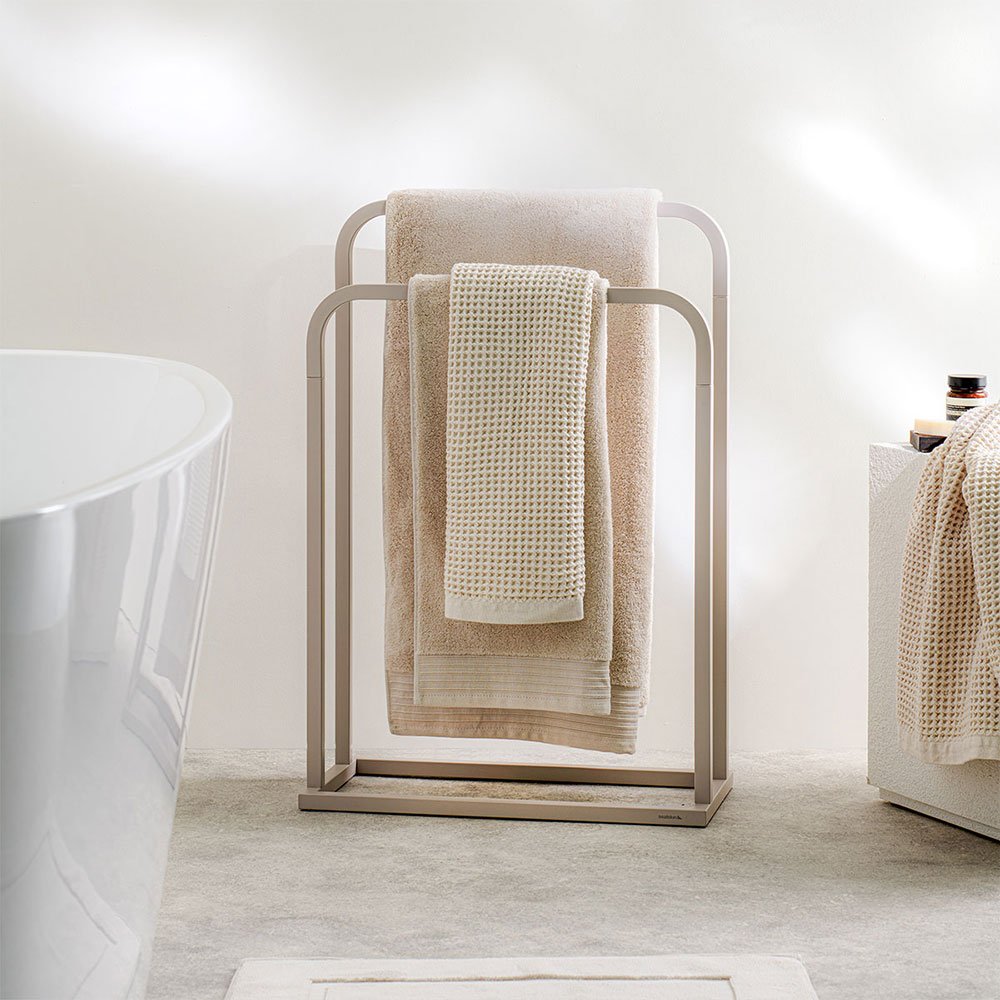 Αυτή η μοντέρνα κρεμάστρα για πετσέτες όχι μόνο προσφέρει πρακτικότητα στο μπάνιο σας, αλλά προσθέτει και μια ζεστή, κομψή πινελιά. Η απαλή μοντέρνα γκρεζ απόχρωση δημιουργεί μια πολυτελή και διαχρονική εμφάνιση, ενώ ο σχεδιασμός δημιουργεί μια αίσθηση ευάερου και ευρύχωρου χώρου. Χάρη στον έξυπνο, ανεξάρτητο σχεδιασμό της, μπορείτε εύκολα να τοποθετήσετε τη κρεμάστρα όπου τη χρειάζεστε. Με αυτόν τον τρόπο, οι πετσέτες σας θα είναι πάντα σε κοντινή απόσταση και στεγνές. Πρακτική, κομψή και ιδανική για κάθε μπάνιο!.