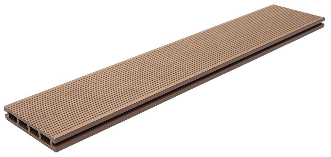 Συνθετικό δάπεδο Deck WPC εξωτερικού χώρου που αποτελείται από 55% ξύλο και 35% HDPE και 10% ρητίνες, UV σταθεροποιητές κλπ. Είναι διπλής όψης με στενό χτένι στη μία όψη και φαρδύ στην άλλη. Ιδανική επιλογή για πάτωμα πισίνας, βεράντας, εξωτερικούς χώρους καταστημάτων, κήπους, μαρίνες κλπ.