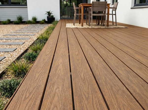 Συνθετικό δάπεδο Deck WPC Premium για εξωτερικούς χώρους, κατασκευασμένο από συνθετικό υλικό ξύλου, HDPE, ρητίνες και UV σταθεροποιητές με προστατευτική εξωτερική στρώση τεχνολογίας co-extrusion. Η ειδική αυτή επικάλυψη προσφέρει αυξημένη αντοχή στην υγρασία, στους λεκέδες, στην ηλιακή ακτινοβολία και στη φθορά από τη χρήση.