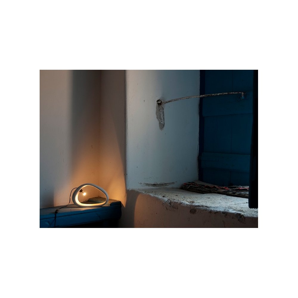 Το επιτραπέζιο φωτιστικό Aretha T δημιουργήθηκε στο εργαστήριο συνδυάζοντας 2 ομόκεντρους κύκλους. Η τυχαία μηχανική παραμόρφωση τους σε συνδυασμό με την πλαστικότητα του μπετού απέδωσαν αυτό το οργανικό σχήμα που αντικατοπτρίζει την ποικιλομορφία της δεκαετίας του ’70. Πρόκειται για ένα πορτατίφ που προσθέτει αξία στην αισθητική ενός χώρου.