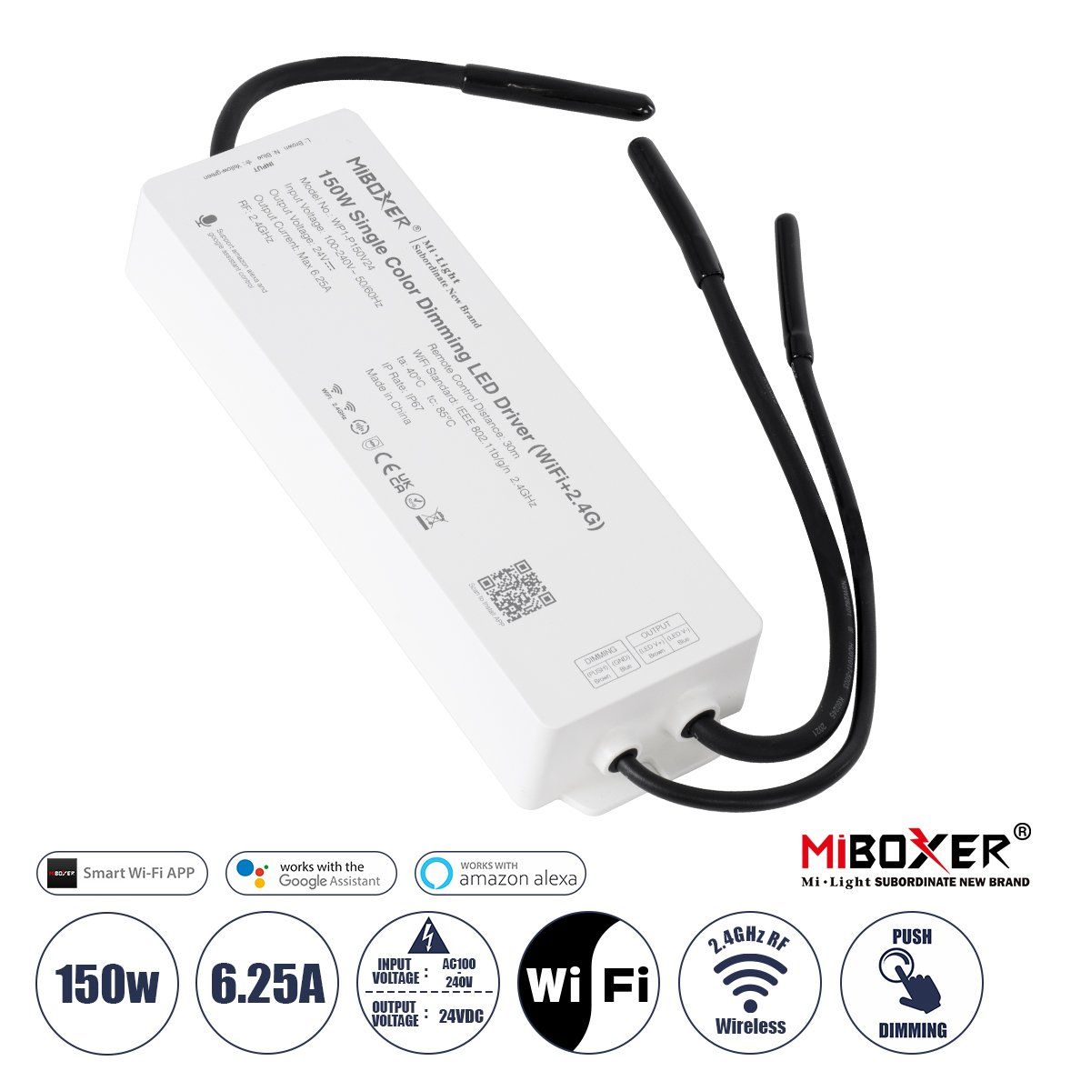 GloboStar® 71438 WP1-P150V24 Mi-BOXER DC Smart Wifi & RF 2.4Ghz & Push Dimming Power Supply Τροφοδοτικό SELV & Controller / Dimmer All in One AC100-240V σε DC 24V 1 x 6.25A 150W – Max 6.25A 150W – Αδιάβροχο IP67 Μ22.5 x Π7 x Υ3.5cm – 3 Years Warranty