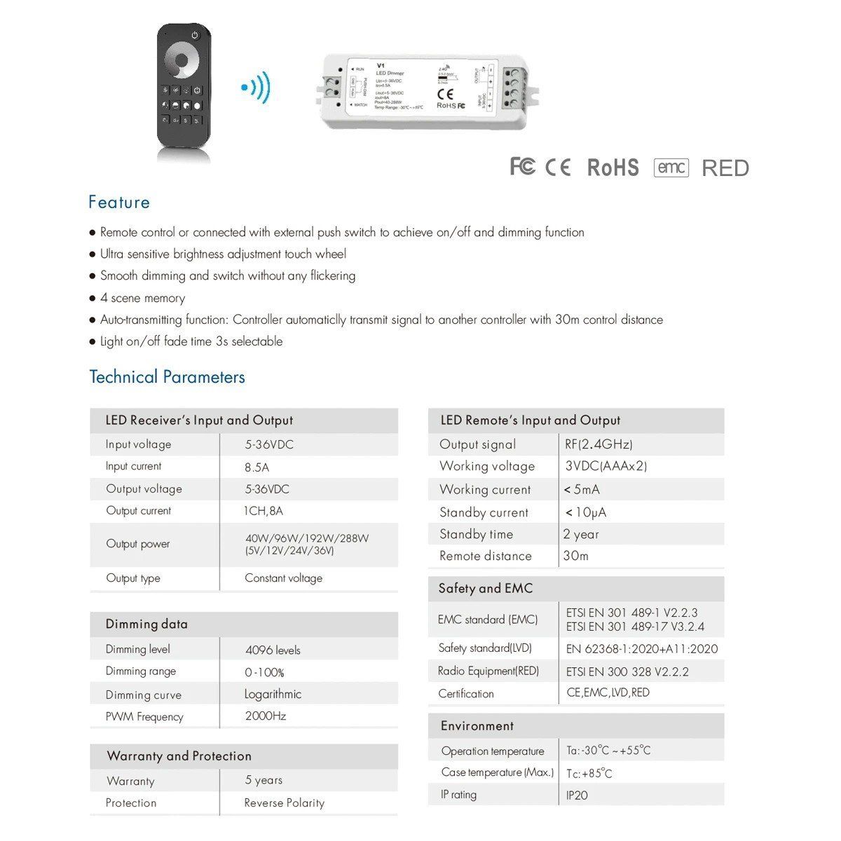 GloboStar® 73118 RT1+V1 SKYDANCE ΣΕΤ Dimmer & Ασύρματο Χειριστήριο Αφής 1 Group RF 2.4Ghz 8A Max DC 5-36V (288W) – DC 3V IP20 – 5 Χρόνια Εγγύηση