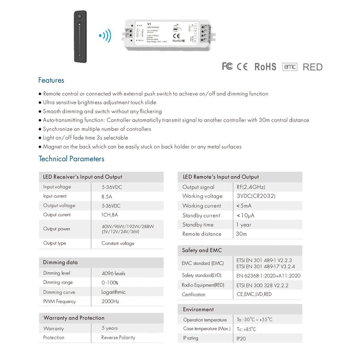 GloboStar® 73119 V1+R11 SKYDANCE ΣΕΤ Dimmer & Ασύρματο Χειριστήριο Αφής 1 Group RF 2.4Ghz 8A Max DC 5-36V (288W) – DC 3V IP20 – 5 Χρόνια Εγγύηση
