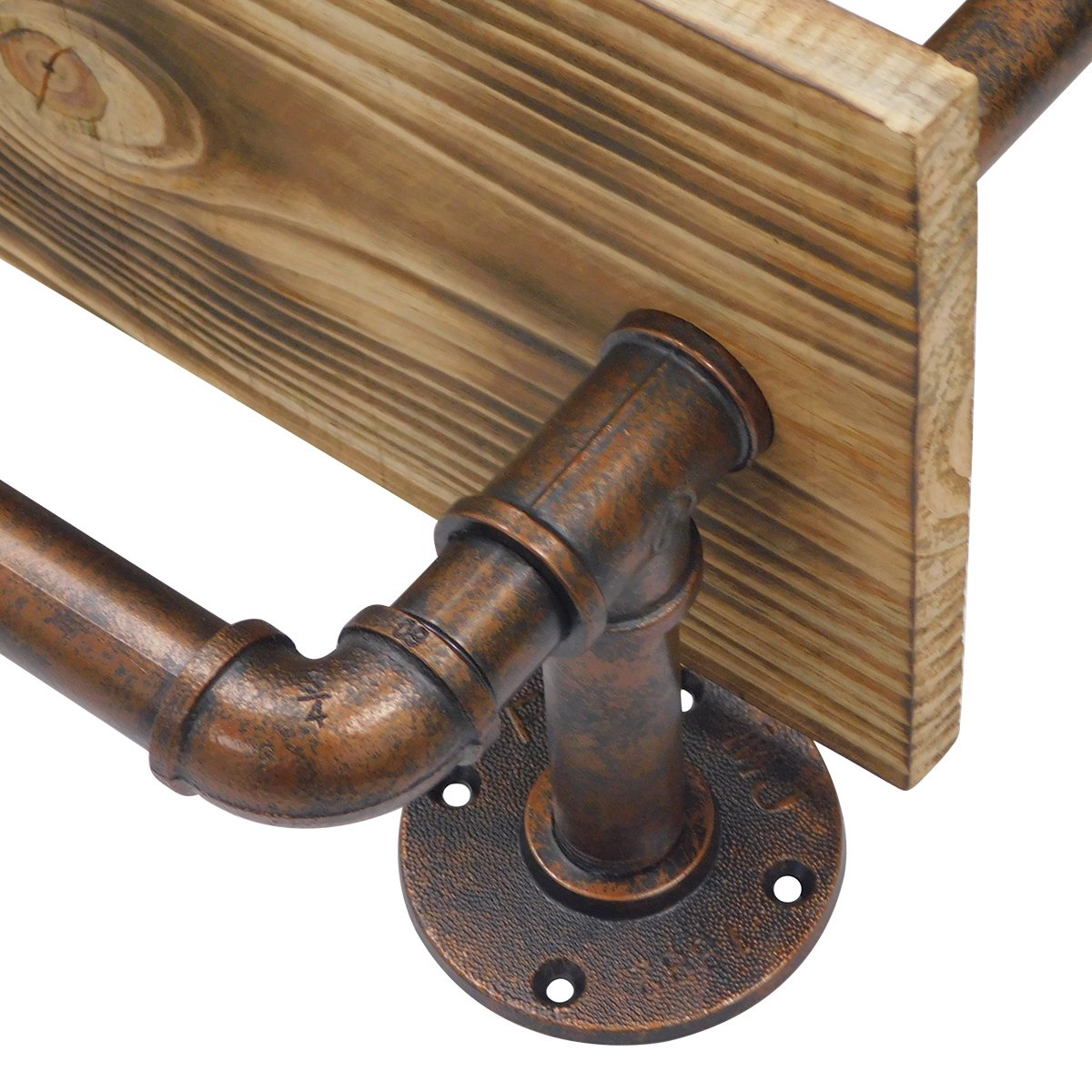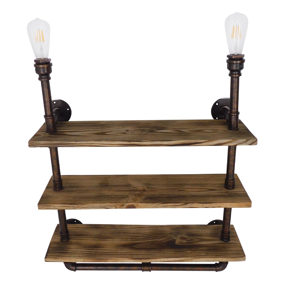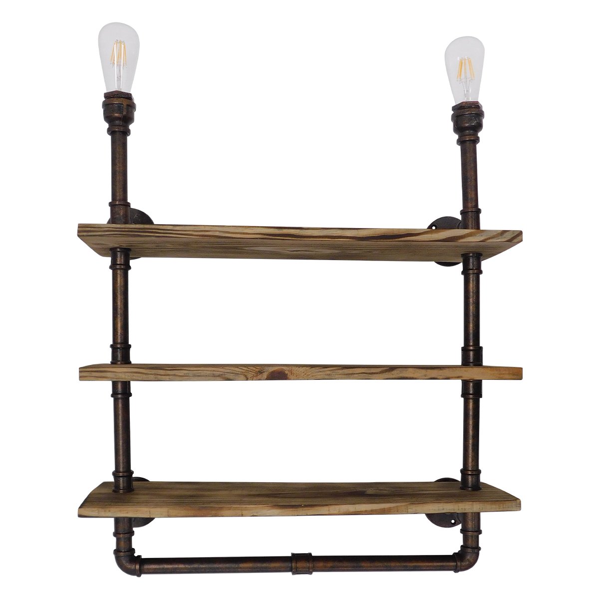 GloboStar® ENIMAS 01217 Vintage Industrial Φωτιστικό Τοίχου Απλίκα Δίφωτο Μπρούτζινο Μεταλλικό με Ξύλινα Ράφια Μ65 x Π23 x Υ76cm