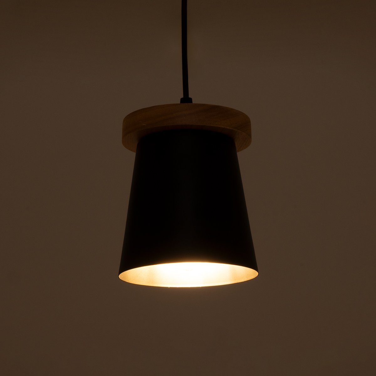 GloboStar® LANA 01424 Μοντέρνο Κρεμαστό Φωτιστικό Οροφής Μονόφωτο με Ξύλινη Βάση και Μαύρο Καπέλο Φ13 x Y17cm