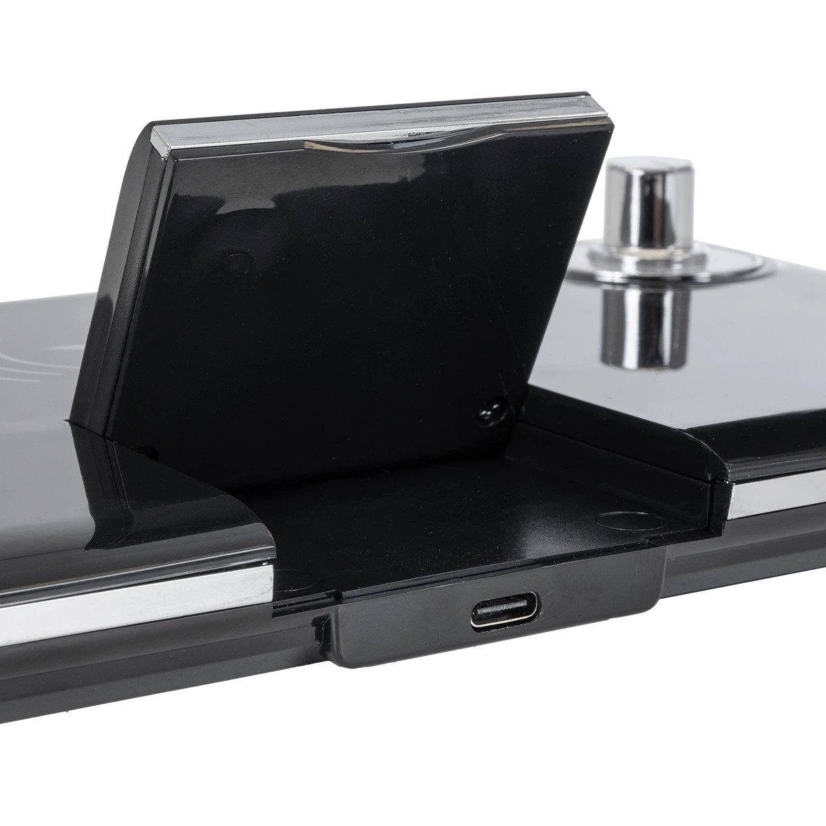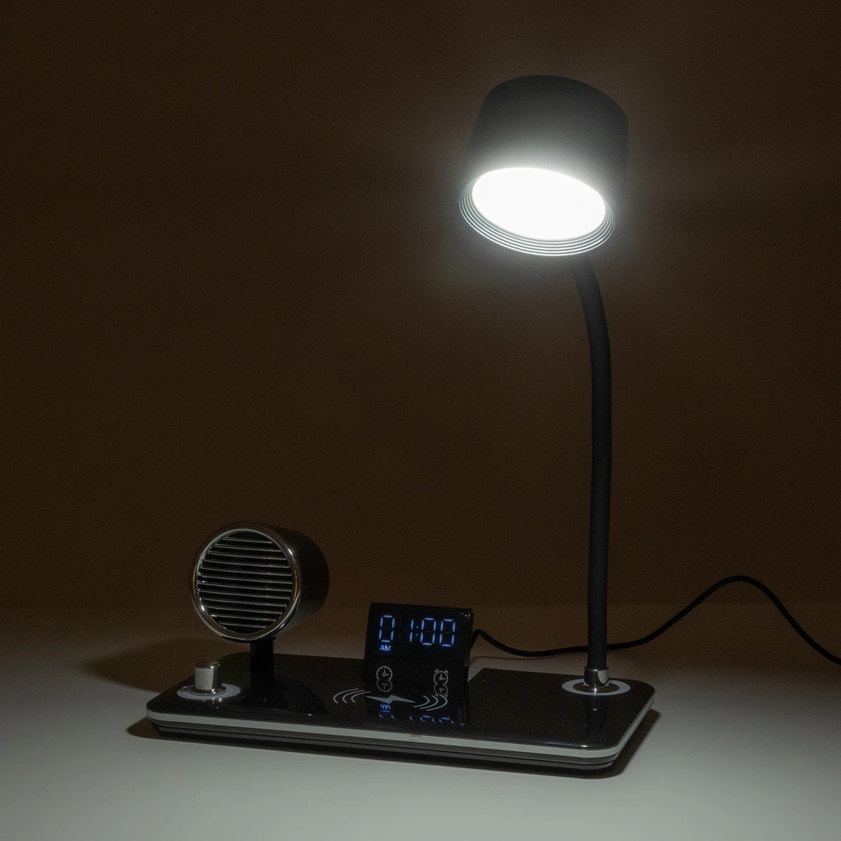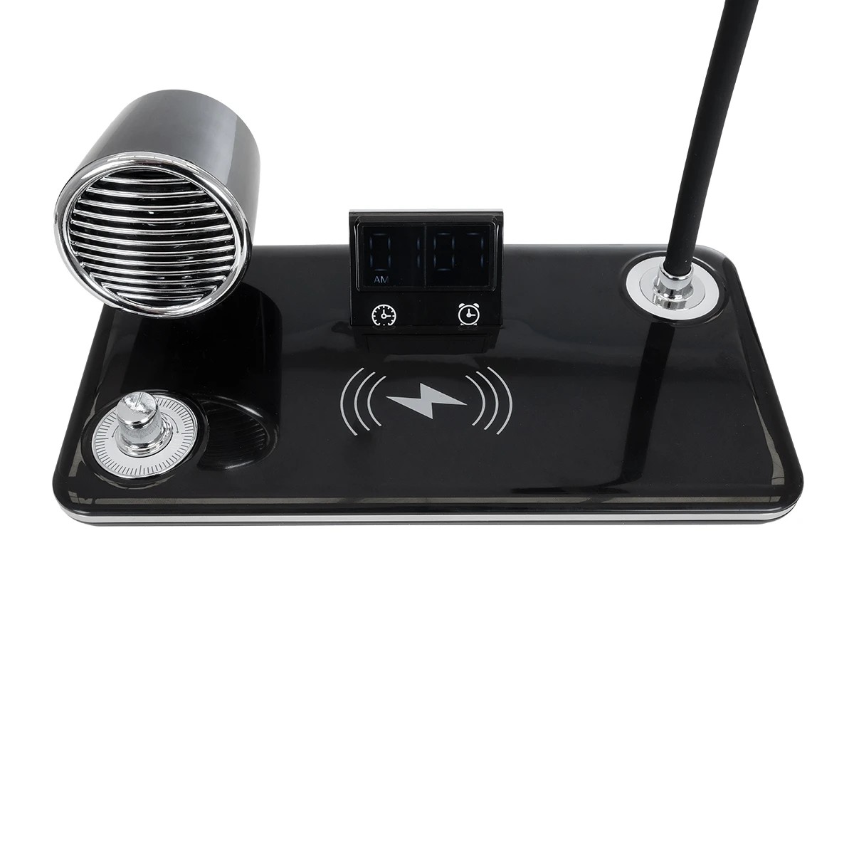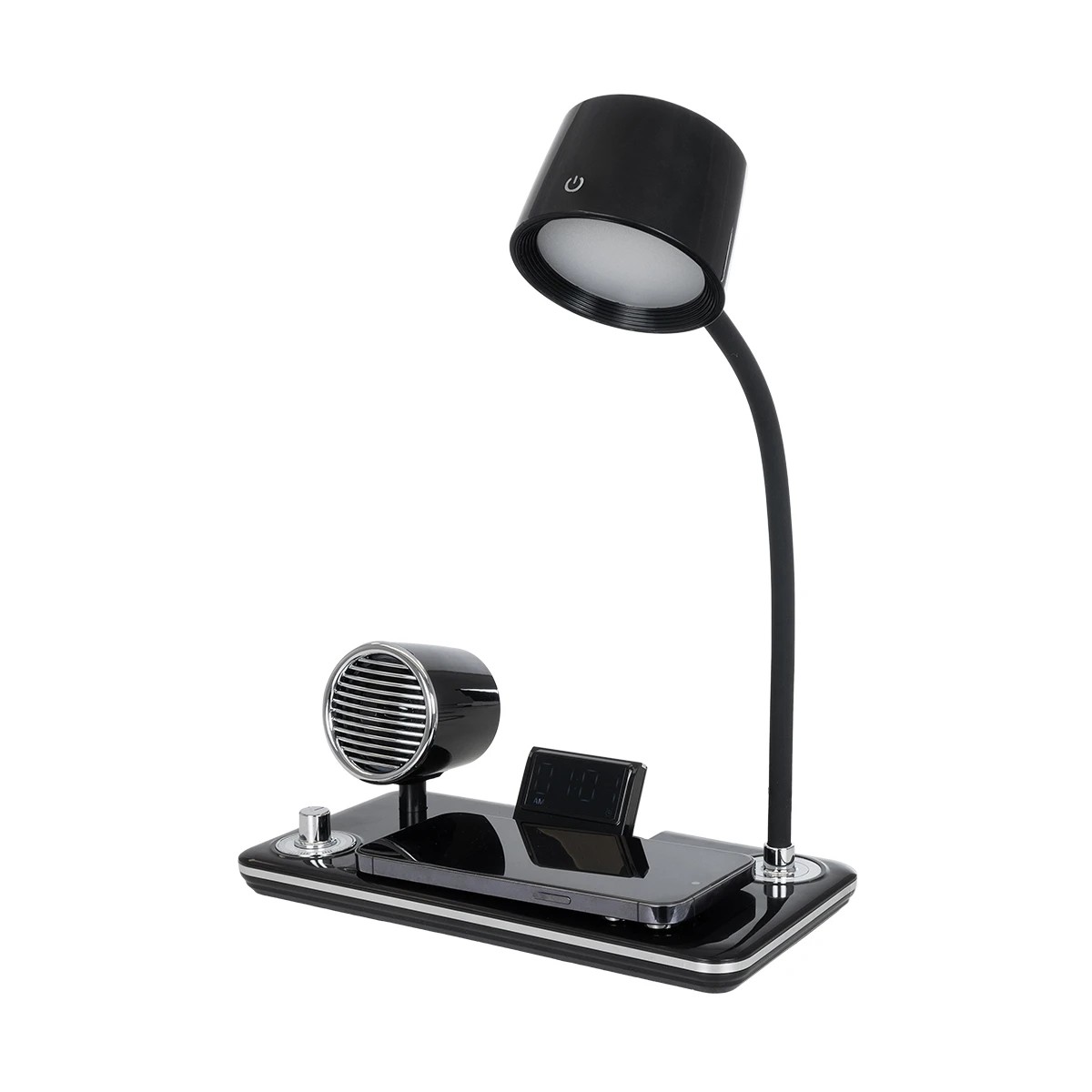GLOBOSTAR® OLDY 76563 Μοντέρνο Επιτραπέζιο Φωτιστικό Γραφείου με Ασύρματη Φόρτιση 15W 3A, 5W Bluetooth Ηχείο & Ψηφιακό Ρολόι LED 3W 300lm 120° DC 5V με USB-C IP20 Ρυθμιζόμενο Λευκό CCT με Αφή 2700K/4500K/6000K Dimmable – Sanan SMD Chip – Μαύρο – Μ13 x Π25 x Υ43cm – 2 Χρόνια Εγγύηση