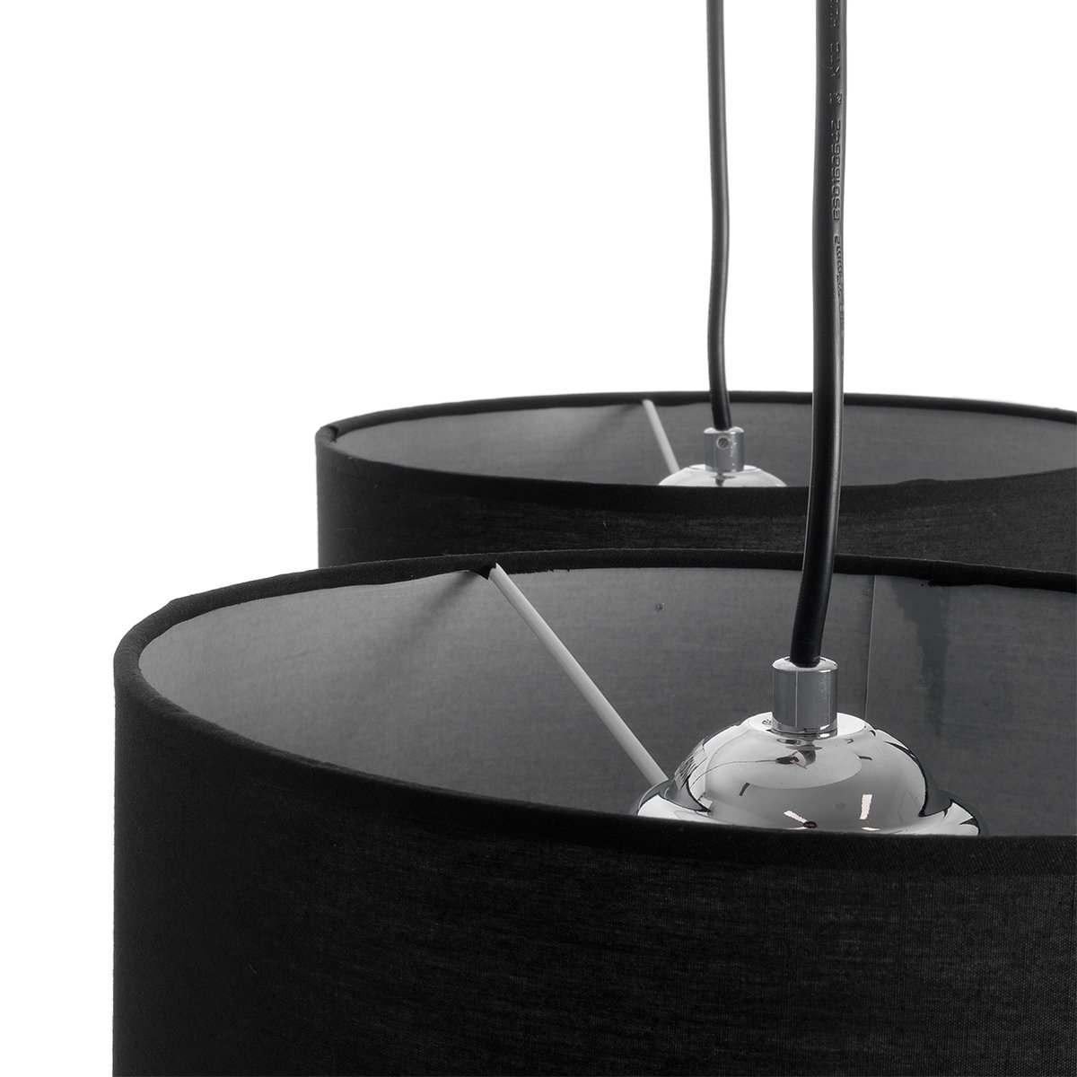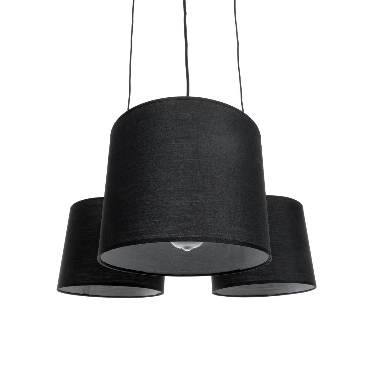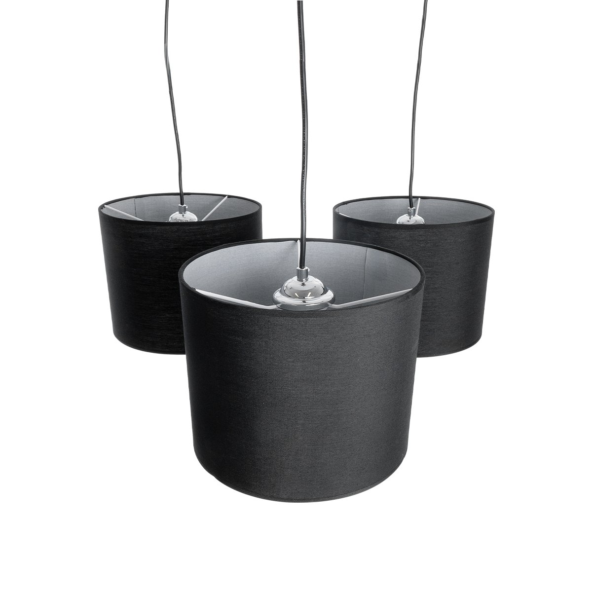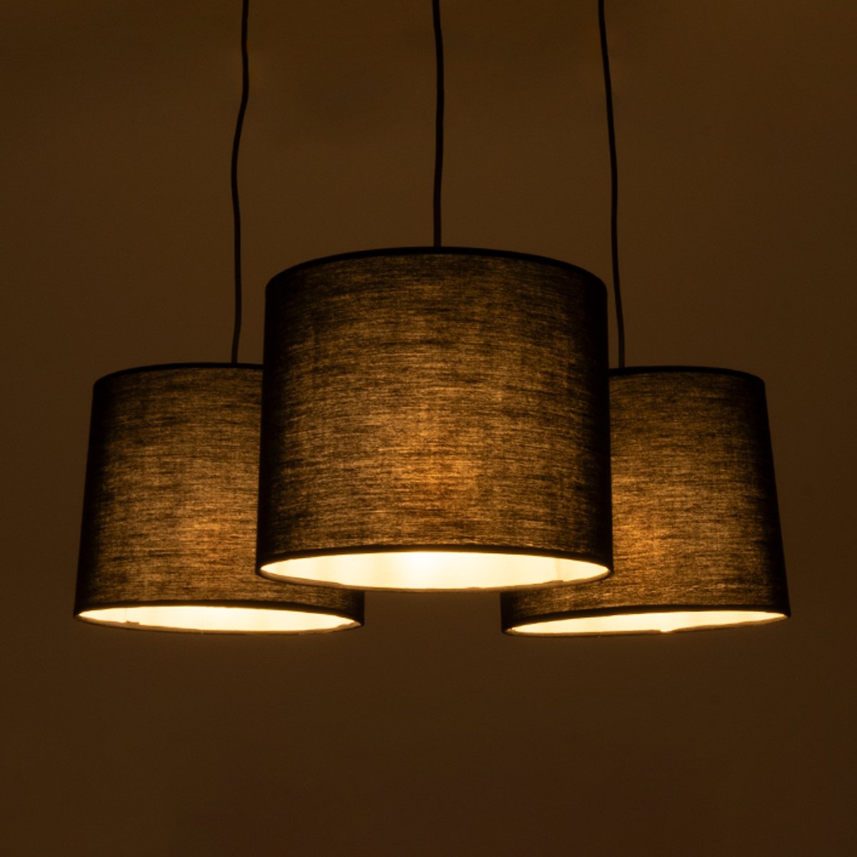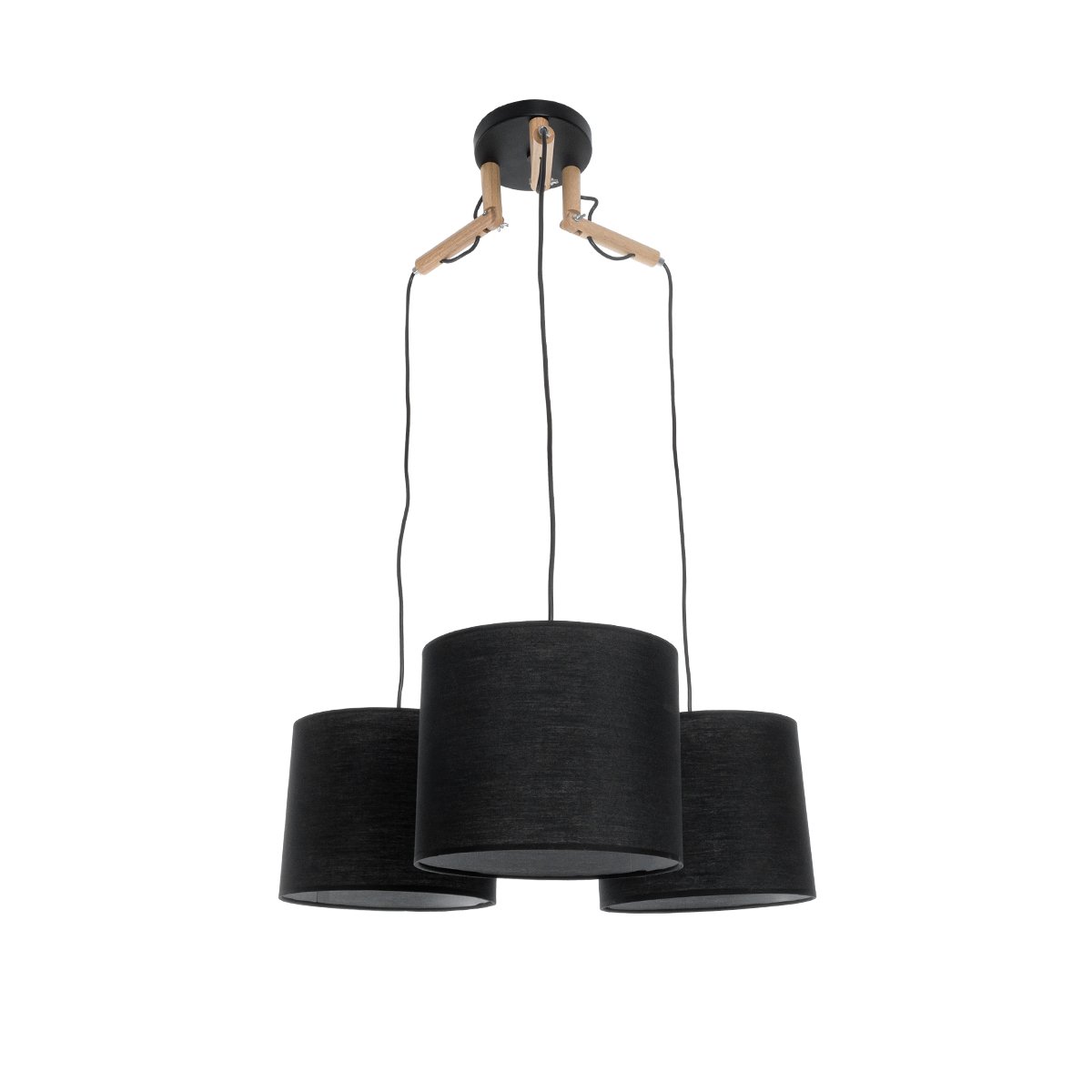 GloboStar® RAMSON 01525 Μοντέρνο Κρεμαστό Φωτιστικό Οροφής Τρίφωτο Μαύρο με Ξύλο και Υφασμάτινα Καπελα Φ67 x Υ65cm