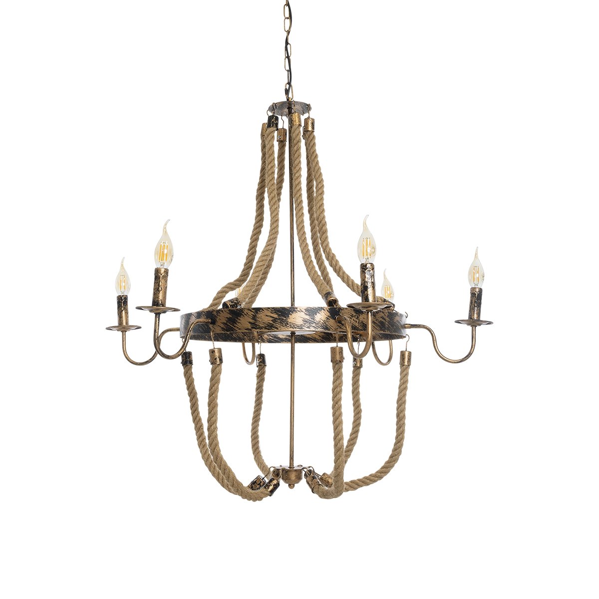 GloboStar® VICTORIAN 01404 Vintage Κρεμαστό Φωτιστικό Οροφής Πολύφωτο Μπρούτζινο Σκουριά Μεταλλικό Πολυέλαιος με Μπεζ Σχοινί Φ76 x Y65cm