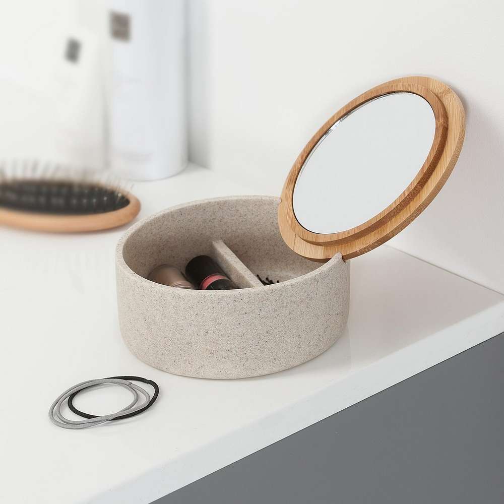 Αυτό το στρογγυλό κουτί κοσμημάτων Grace με καθρέφτη της Sealskin είναι ένα πραγματικό κόσμημα για το ράφι του μπάνιου ή το κομοδίνο. Μπορείτε να αποθηκεύσετε τα κοσμήματά σας σε αυτό το καλαίσθητο δοχείο και όταν το καπάκι τοποθετηθεί στις ειδικές εγκοπές, το κουτί μετατρέπεται σε καθρέφτη μακιγιάζ.