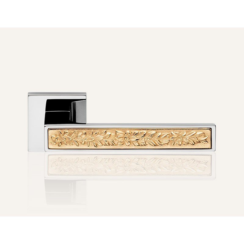 Η λαβή έχει ρομαντικά λουλουδάτα σχέδια και διατίθεται σε συνδυασμούς φινιρισμάτων όπως χρυσό/χρώμιο, χρώμιο/ματ μαύρο και μπρονζέ.