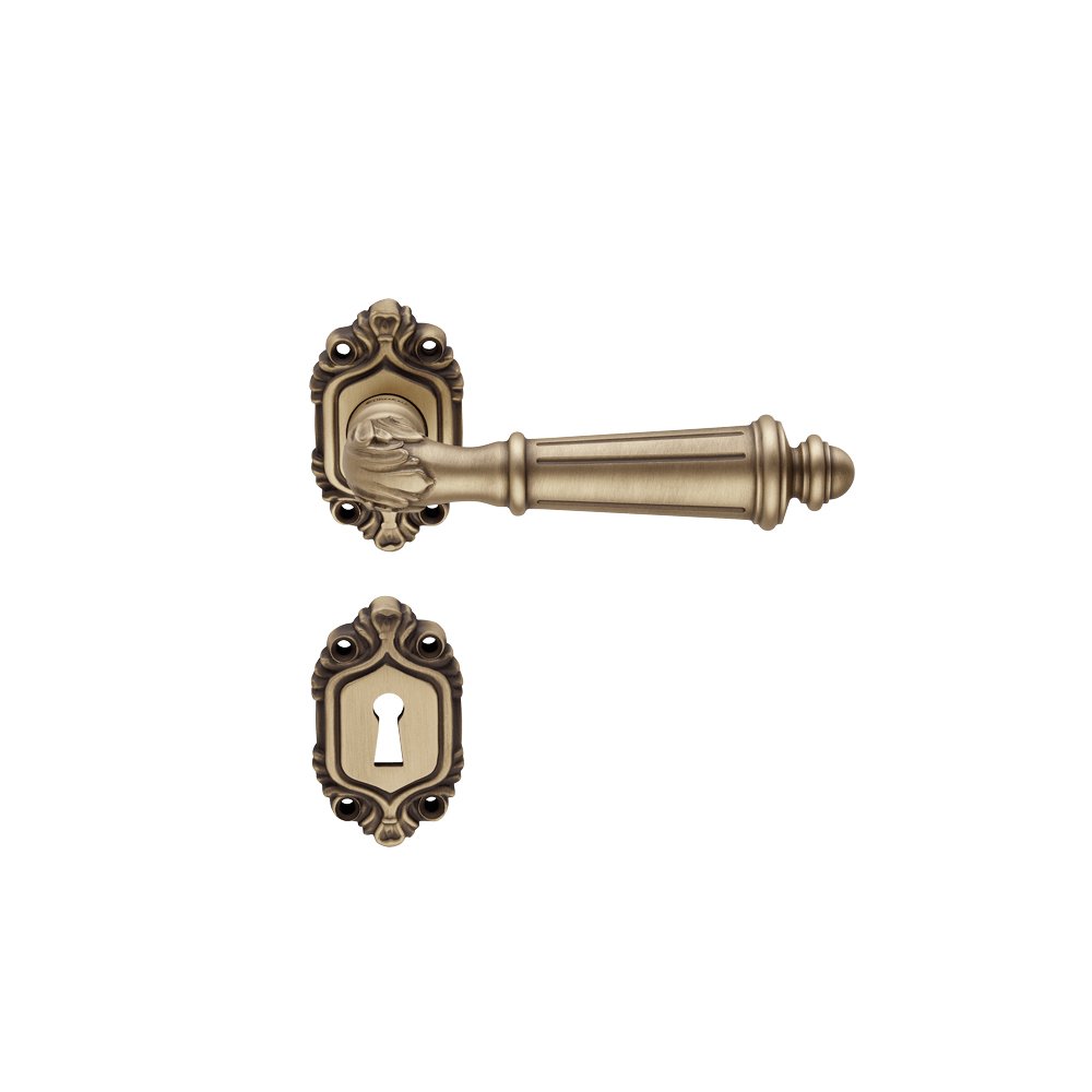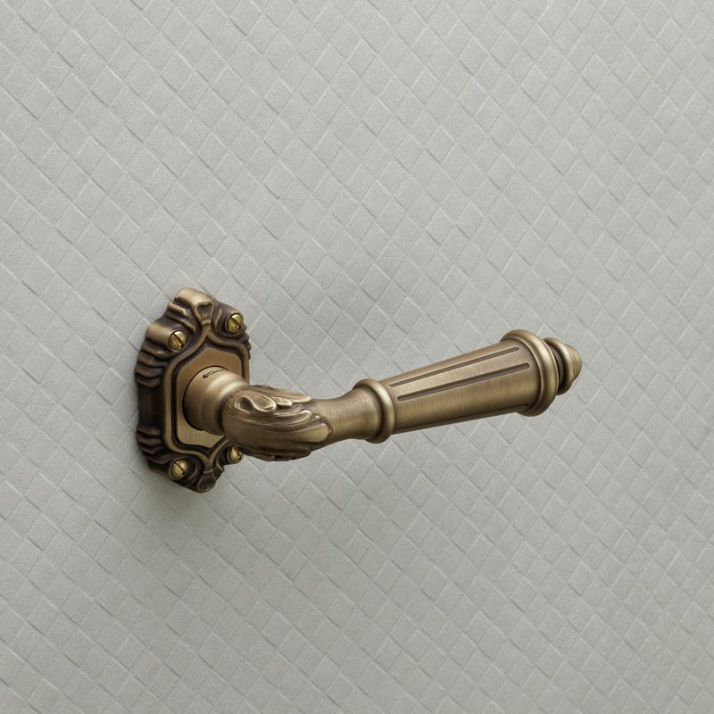 Με λεπτές διακοσμητικές χαράξεις και ανάγλυφα μοτίβα, τα πόμολα διαθέτουν ροζέτα με στριφογυριστό σχέδιο και λαβή με λουλουδάτο μοτίβο που καταλήγει σε κωνικό σχήμα.