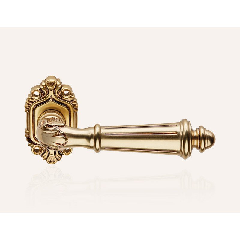Με λεπτές διακοσμητικές χαράξεις και ανάγλυφα μοτίβα, τα πόμολα διαθέτουν ροζέτα με στριφογυριστό σχέδιο και λαβή με λουλουδάτο μοτίβο που καταλήγει σε κωνικό σχήμα.
