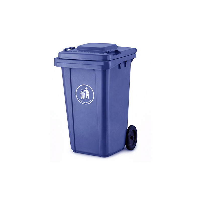 Πλαστικός κάδος απορριμμάτων 120 λίτρων σε μπλέ χρώμα, κατασκευασμένος από ανθεκτικό πλαστικό για καθημερινή χρήση.
