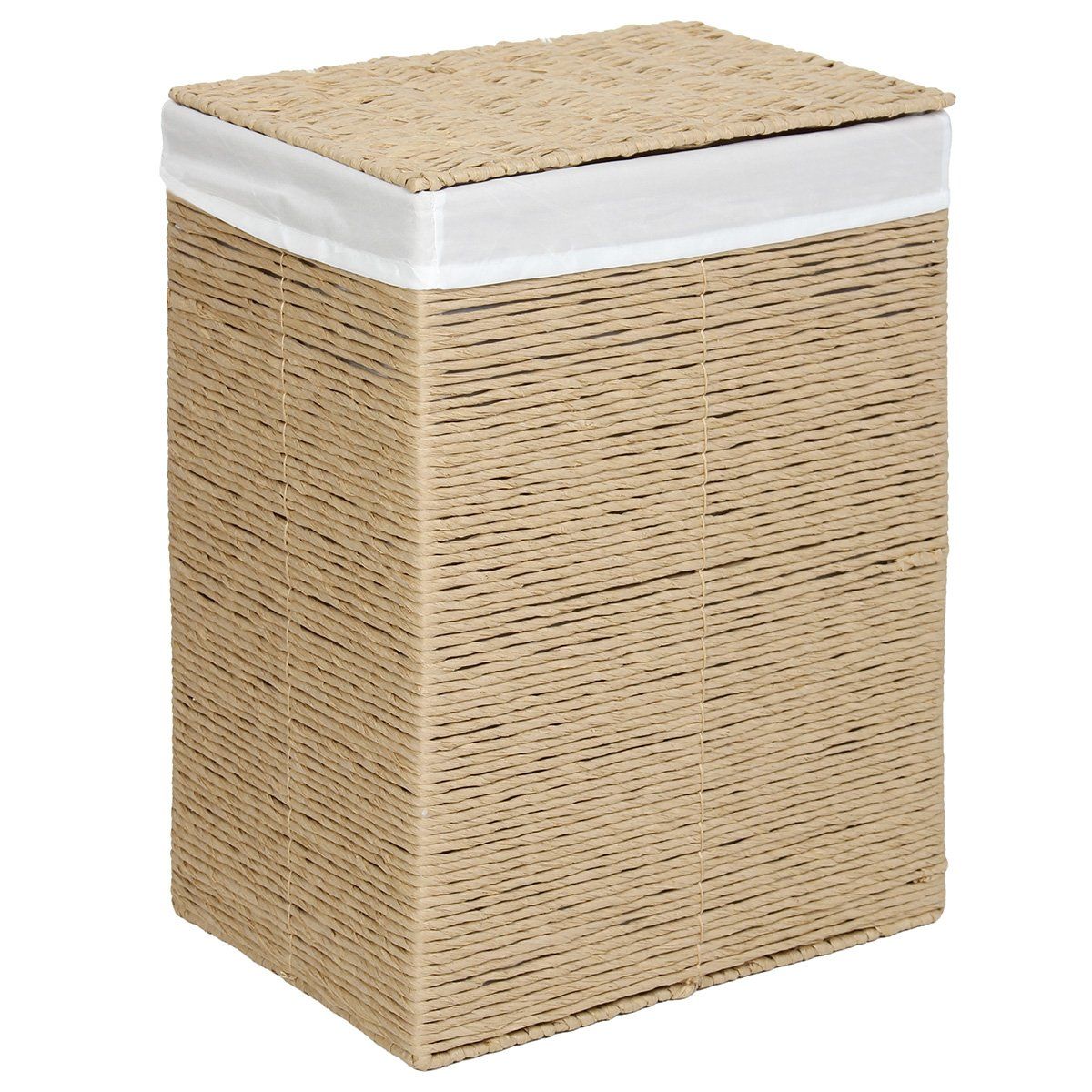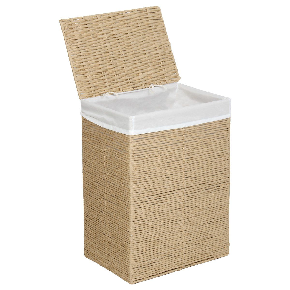 Καλάθι απλύτων ολόκληρο από καφέ σχοινί, ανθεκτικό και ελαφρύ, με υφασμάτινη θήκη στο εσωτερικό.