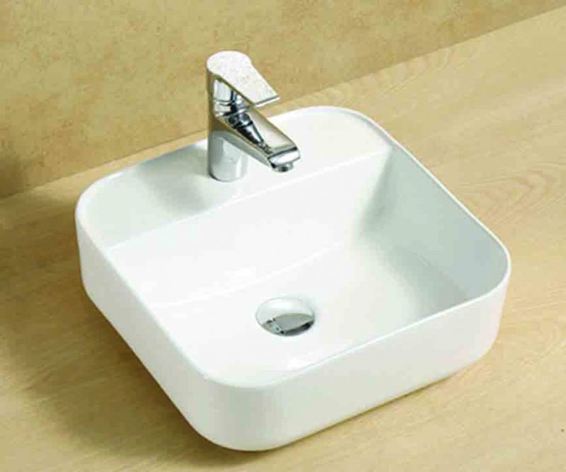 Νιπτήρας πορσελάνης λευκός επικαθήμενος χωρίς υπερχείλιση με οπή για τοποθέτηση μπαταρίας στο κέντρο.