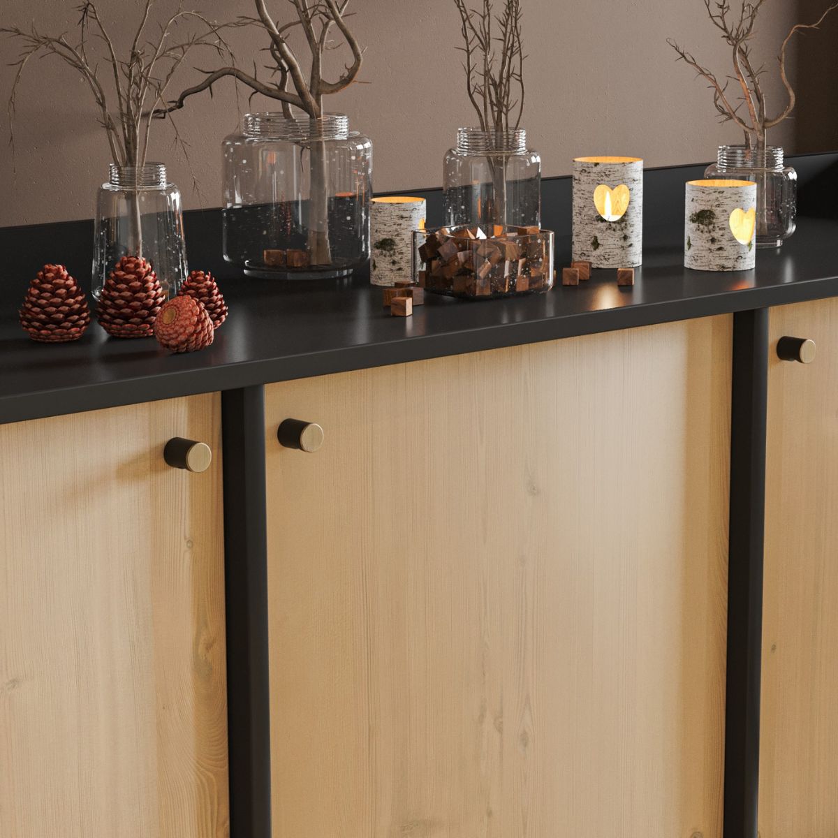 Ένα ιδιαίτερο ξύλινο πόμολο επίπλου για έπιπλα δωματίου και σαλονιού, σε συνδιασμό δρυς με μαύρο.