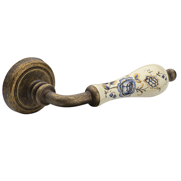 Ένα πόμολο πόρτας κορυφαίας ποιότητας με κλασικό design που ξεχωρίζει, σε χρώμα αντικέ. Είναι κατασκευασμένο από ορείχαλκο με μπεζ πορσελάνη και σχέδιο από μπλε λουλούδι με χρυσές λεπτομέρειες. Χαρακτηρίζεται για την κομψότητα και το φινίρισμά του.