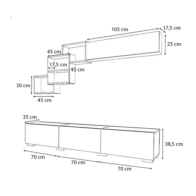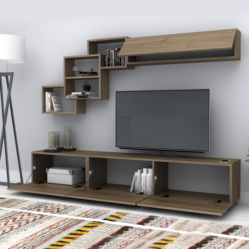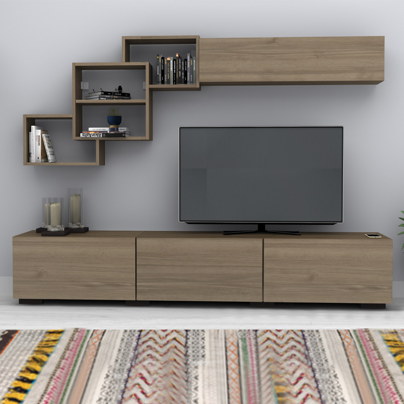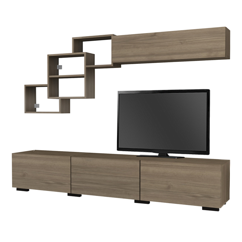 - Η σύνθεση αποτελείται από ένα έπιπλο τηλεόρασης, μία ραφιέρα τοίχου και ένα οριζόντιο μονόφυλλο ντουλάπι.