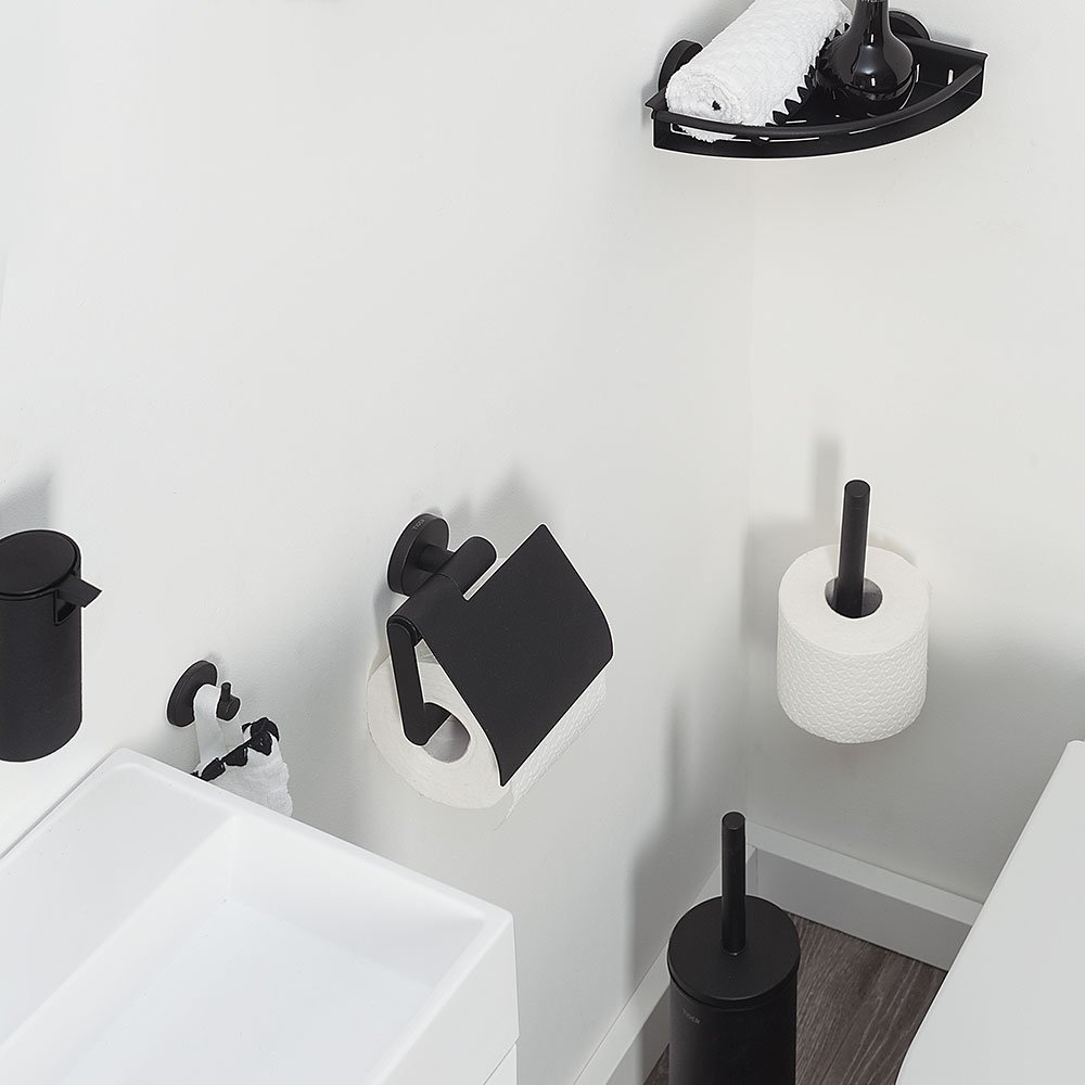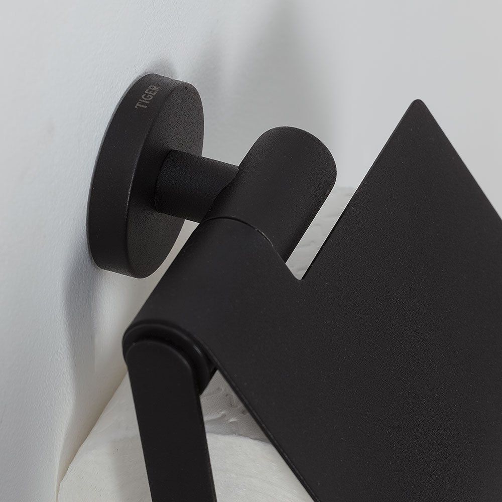 Η θήκη ρολού τουαλέτας Tiger Boston με κάλυμμα διαθέτει σύγχρονο μαύρο ματ φινίρισμα. Η θήκη ρολού τουαλέτας μπορεί εύκολα να τοποθετηθεί σε οποιαδήποτε επιθυμητή θέση στον τοίχο, έτσι ώστε το χαρτί υγείας να είναι πάντα εύκολα προσβάσιμο. Το προϊόν είναι προσαρτημένο σε μια πλάκα τοίχου, πράγμα που σημαίνει ότι το υλικό τοποθέτησης (περιλαμβάνεται) είναι κρυμμένο για μια κομψή εμφάνιση. Η σειρά Boston περιλαμβάνει μια μεγάλη ποικιλία από άλλα αξεσουάρ για το μπάνιο και την τουαλέτα, όλα όμορφα συνδυασμένα.