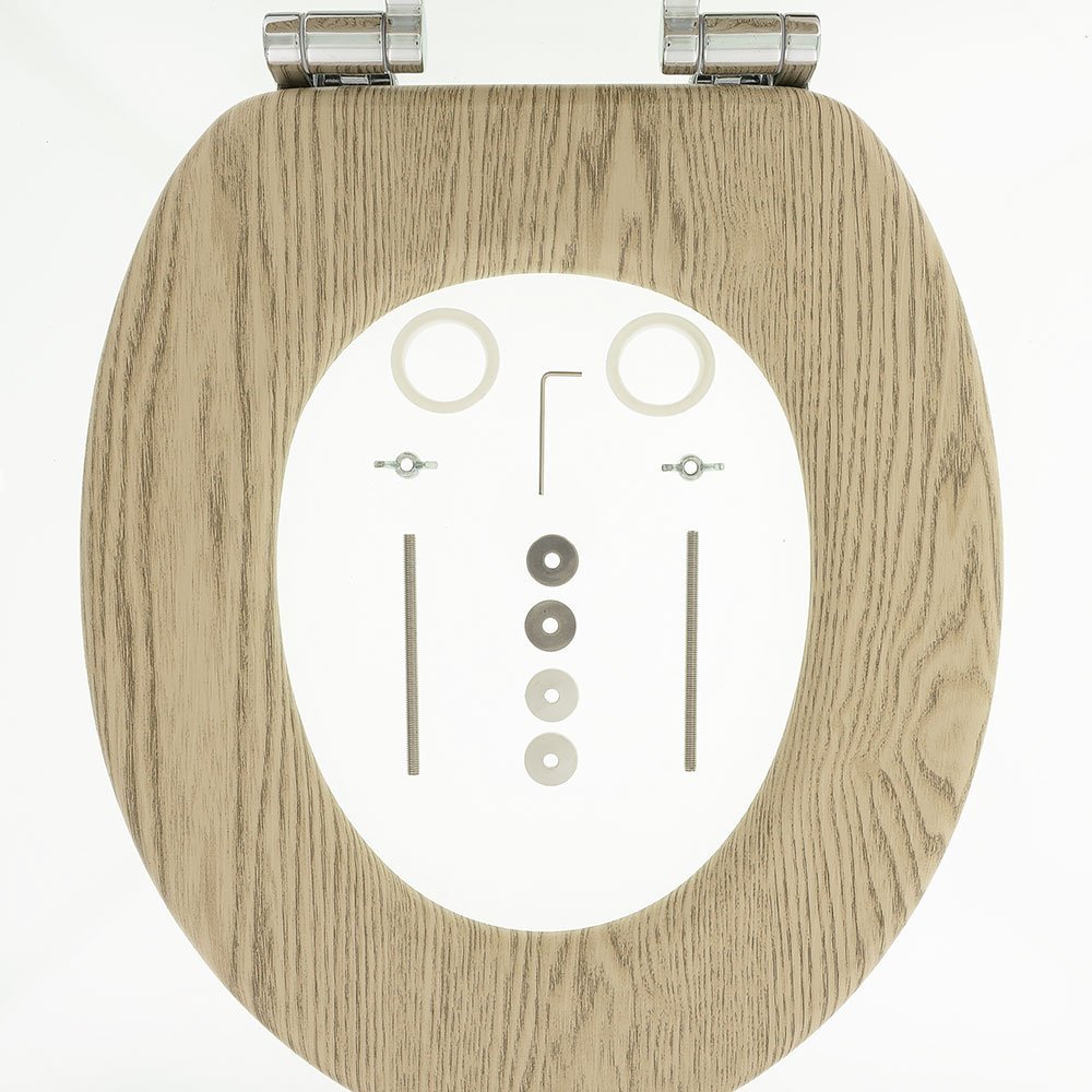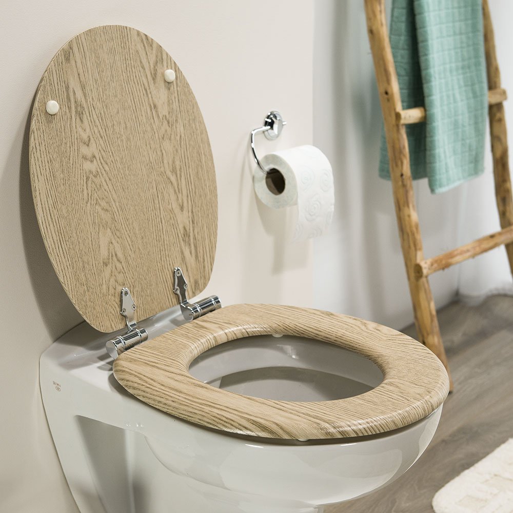 Με τους ασημένιους μεντεσέδες του, αυτό το κάθισμα τουαλέτας έχει μια διαχρονική εμφάνιση που ταιριάζει επίσης καλά σε ένα industrial μπάνιο ή τουαλέτα. Η τεχνική soft-close εξασφαλίζει ότι το κάθισμα κλείνει απαλά στη λεκάνη τουαλέτας. Το κάθισμα είναι κατασκευασμένο από MDF, ώστε να μην το αισθάνεστε ποτέ κρύο και να εφαρμόζει πάντα άνετα. Διαθέτουν επίστρωση έτσι ώστε το κάθισμα να παραμένει χωρίς γρατσουνιές και εύκολο να καθαριστεί. Τα χρώματα του ξύλου μπορεί να διαφέρουν ελαφρώς από το αρχικό χρώμα του ξύλου στις εικόνες. Πριν αντικαταστήσετε το κάθισμα τουαλέτας σας, συνιστάται να ρίξετε επίσης μια ματιά στο γραμμικό σχέδιο αυτού του άρθρου. Περιέχει όλες τις απαραίτητες μετρήσεις και αν αυτές ταιριάζουν με τη λεκάνη της τουαλέτας σας, είστε σίγουροι για ένα σταθερό και κατάλληλο εξάρτημα.