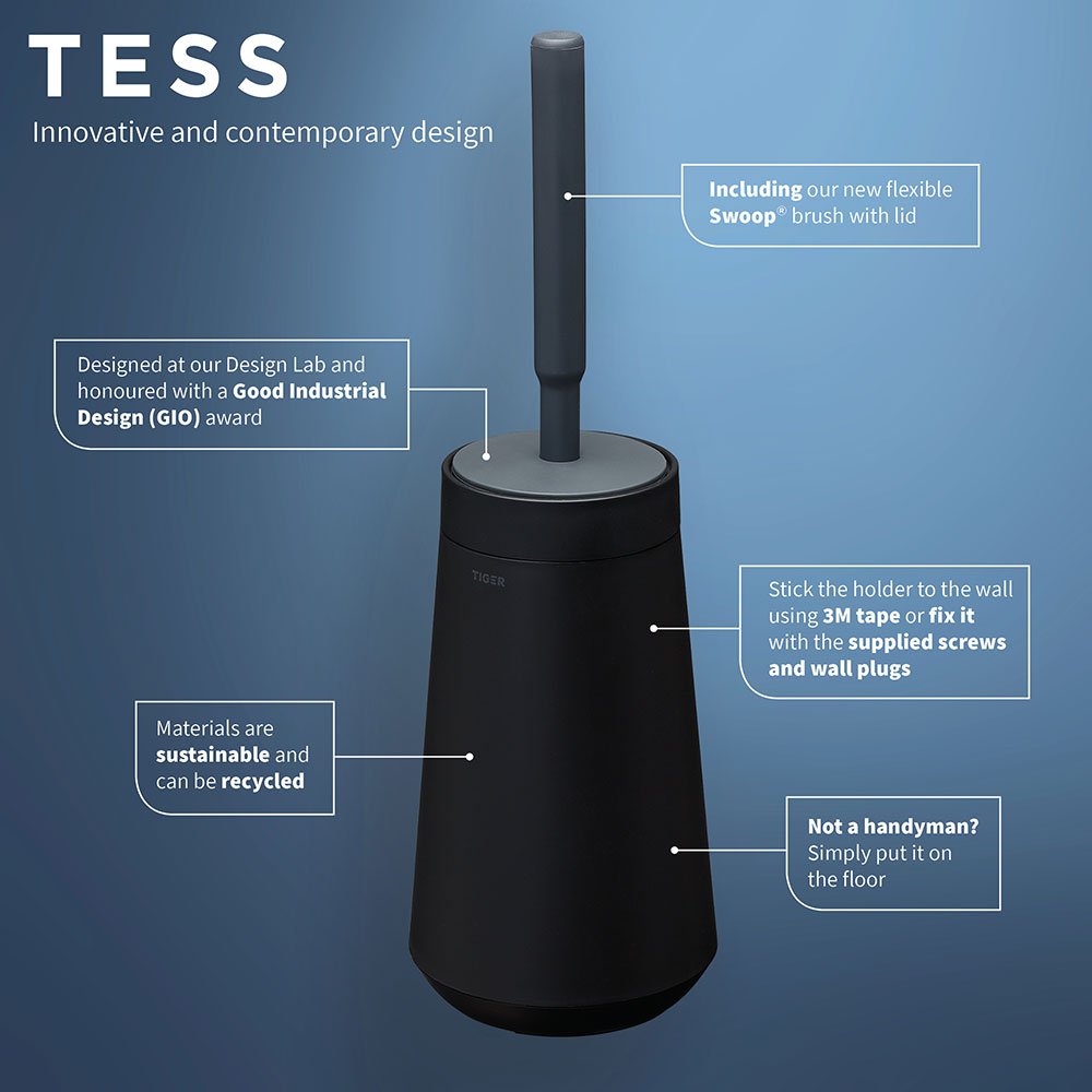Μια φρέσκια, μοντέρνα αίσθηση στην τουαλέτα ή το μπάνιο χάρη σε αυτό το μαύρο πιγκάλ από τη σειρά Tiger Tess. Πηγαίνει στον τοίχο ή στο πάτωμα. Κολλήστε ή στερεώστε με βίδες και βύσματα τοίχου. Εξαρτάται αποκλειστικά από εσάς. Αυτή η βάση διαθέτει τη νέα εύκαμπτη βούρτσα τουαλέτας Swoop®. Μπορείτε εύκολα να καθαρίσετε δυσπρόσιτες περιοχές χρησιμοποιώντας αυτήν την πρωτοποριακή κεφαλή βούρτσας. Χάρη στο σχήμα και το ειδικό υλικό με τις ιδιότητες της σιλικόνης, δεν αφήνει πίσω του βρωμιά και δεν στάζει σχεδόν καθόλου μόλις το ξαναβάλετε στη θήκη. Το Tiger Tess είναι καινοτόμο και σύγχρονο, με τη γνωστή ποιότητα Tiger. Αυτή η σειρά σχεδιάστηκε στο Design Lab μας και έχει τιμηθεί με το βραβείο Good Industrial Design (GIO).