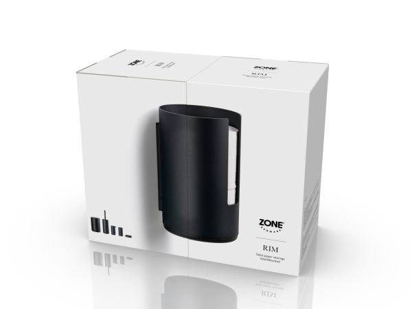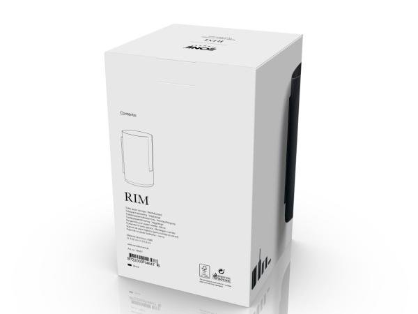 Η rim είναι μία μοντέρνα χαρτοθήκη για το ρολό χαρτιού υγείας που δημιουργήθηκε για να εξοικονομεί χώρο και να διευκολύνει την καθημερινότητά μας. Η σειρά rim προσφέρει κομψές επιτοίχιες λύσεις. όπως δοχείο κρεμοσάπουνου. ποτήρι για οδοντόβουρτσες. κάδο με πεντάλ. χαρτοθήκη. πιγκάλ με αποθηκευτικό χώρο για επιπλέον ρολά τουαλέτας – όλα κομψά και πρακτικά σχεδιασμένα ώστε να προσαρμόζονται εύκολα στον τοίχο. Χάρη στο κρυφό στήριγμα. η συνολική εικόνα τους παραμένει τακτοποιημένη και κομψά αιωρούμενη. Τα προϊόντα είναι κατασκευασμένα από αλουμίνιο με επένδυση ηλεκτροστατικής βαφής και διατίθενται σε μαύρο και λευκό χρώμα. Περιλαμβάνονται βίδες και ούπα για επιτοίχια στήριξη στον τοίχο.
