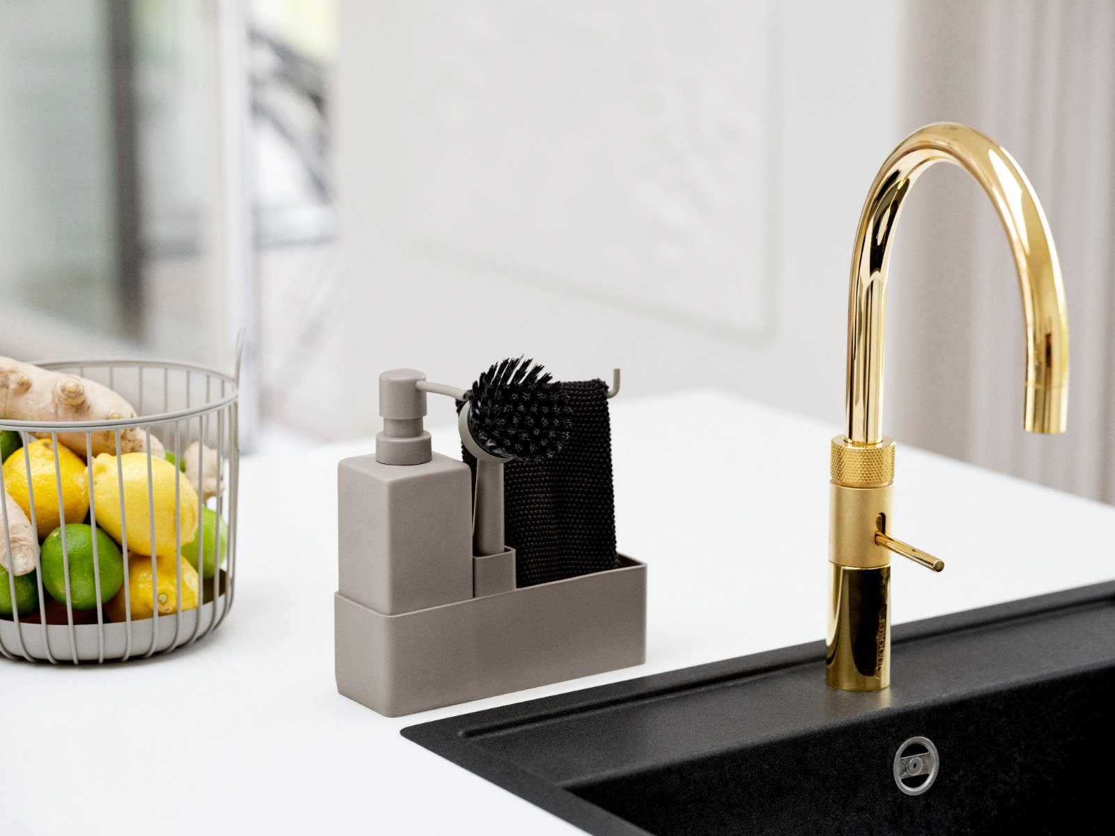 Διατηρήστε την επιφάνεια της κουζίνας σας τακτοποιημένη με ένα πρακτικό σετ από αξεσουάρ γκρι-καφέ (taupe) χρώματος που έχουν ιδανικό μέγεθος και όμορφο στιλ. Στο σετ κουζίνας της zone denmark συμπεριλαμβάνονται: 1 κεραμικό δοχείο κρεμοσάπουνου. 1 βούρτσα καθαρισμού πιάτων με αποσπώμενη κεφαλή. 1 βαμβακερή πετσέτα κουζίνας. 1 βάση οργάνωσης από σιλικόνη. Είναι μια επιλογή από προϊόντα υψηλής ποιότητας που προσθέτουν χρώμα και άνεση στην καθημερινότητά σας.
