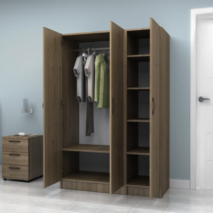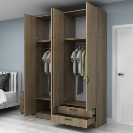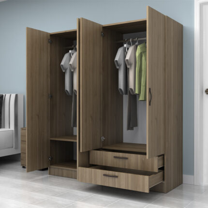Original price was: 516,00 €.434,00 €Η τρέχουσα τιμή είναι: 434,00 €.Ντουλάπα ρούχων Vivian Megapap τετράφυλλη με συρτάρια χρώμα καρυδί 160×51,8×181εκ.